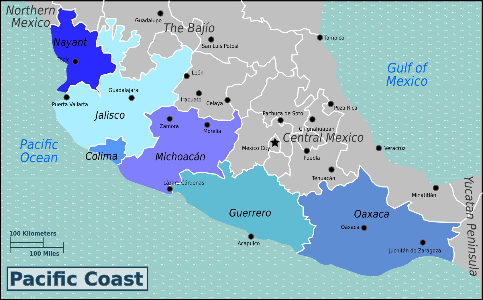 Mapa da costa do pacífico de México. México, costa do pacífico mapa (América Central, América) para imprimir. México, costa do pacífico mapa (América Central, América) para descargar.